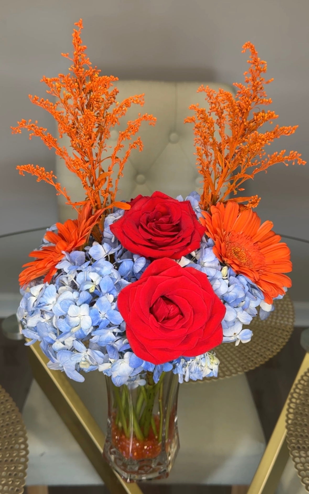 All vase bouquets come with crystals or marbles. Due to seasonal changes, some flower colors may be unavailable. We will reach out before delivery, if this is the case.