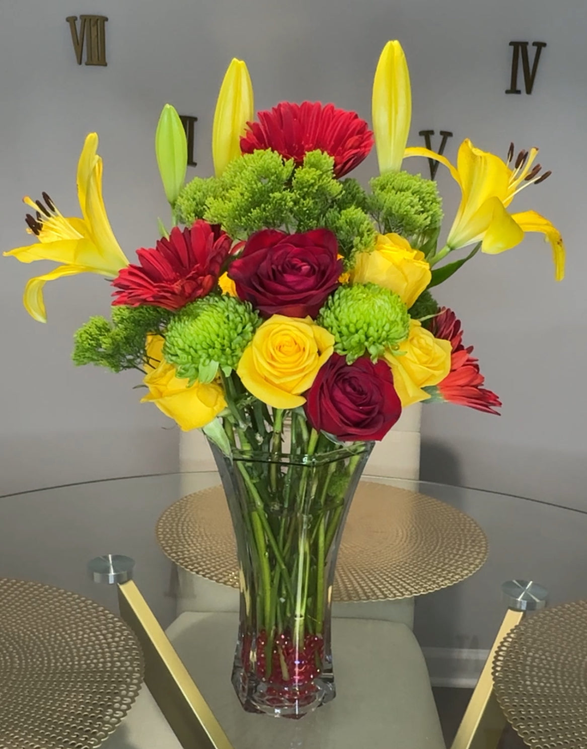 All vase bouquets come with crystals or marbles. Due to seasonal changes, some flower colors may be unavailable. We will reach out before delivery, if this is the case.