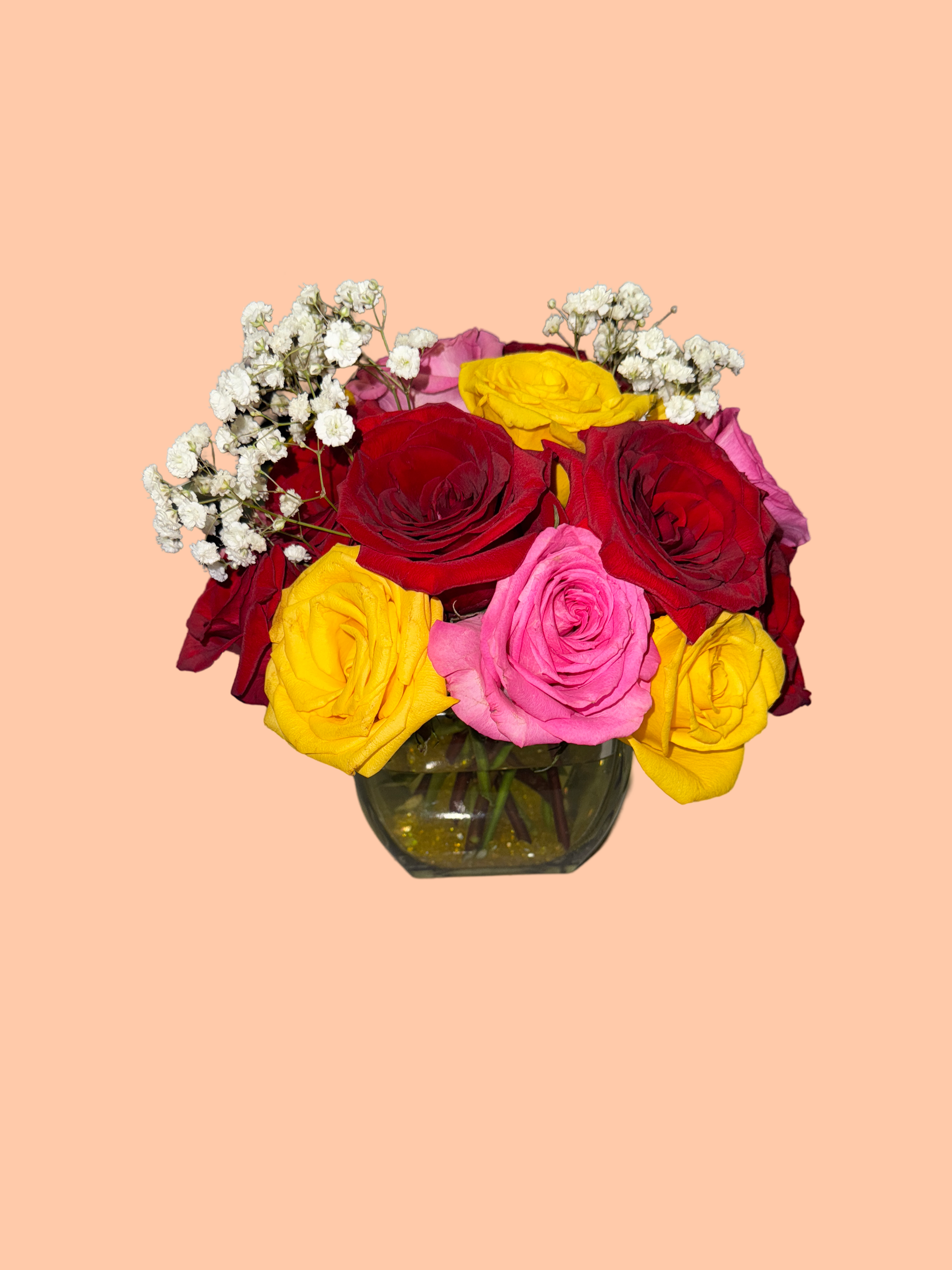 This bouquet comes with 1 dozen roses, and accent stems of baby’s breath. Please specify your desired rose colors in the "Order Special Instructions" section, of checkout page. The colors we offer are: