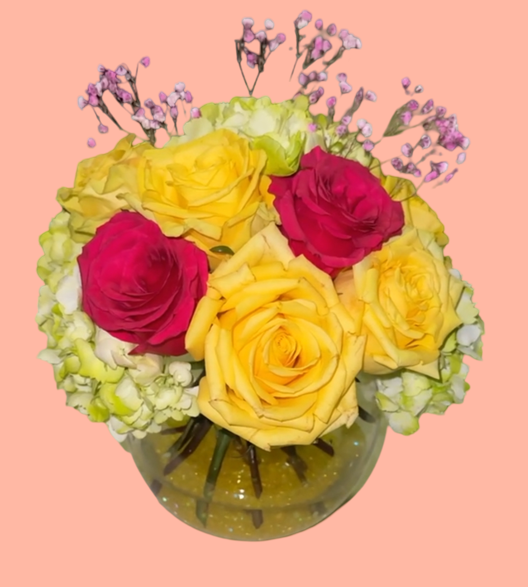 This bouquet comes with 7-9 roses, 2 stems of hydrangeas, 2 carnations, and pink (seasonal) or white baby’s breath. Please note, if pink baby’s breath is unavailable, it will be substituted with white. These specifications come from the pictured item. The amount of flowers can vary, depending on the type of vase you choose, and size of flower(s).